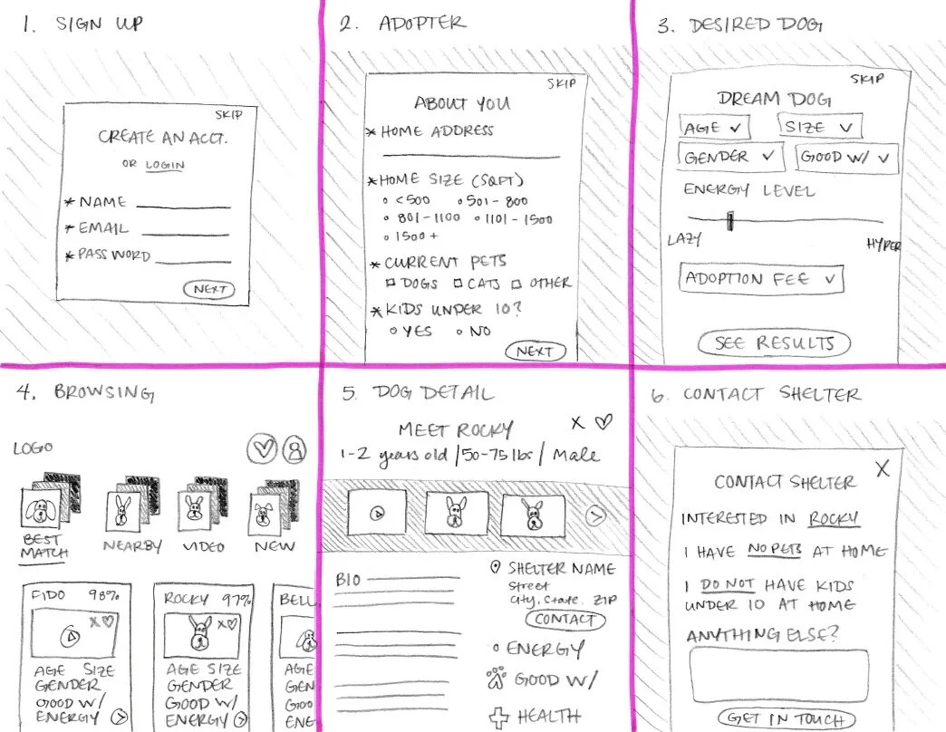 Every time a shelter dog gets adopted, an angel gets their wings (…or whatever it is ZuZu Bailey says in It’s a Wonderful Life to get the waterworks going). I volunteered at a rural animal shelter for years as a dog socializer and handler, often lamenting that truly amazing dogs were there far too long - so this project was especially important to me. This project was a modified GV Design Sprint completed as part of my Springboard UX design program.